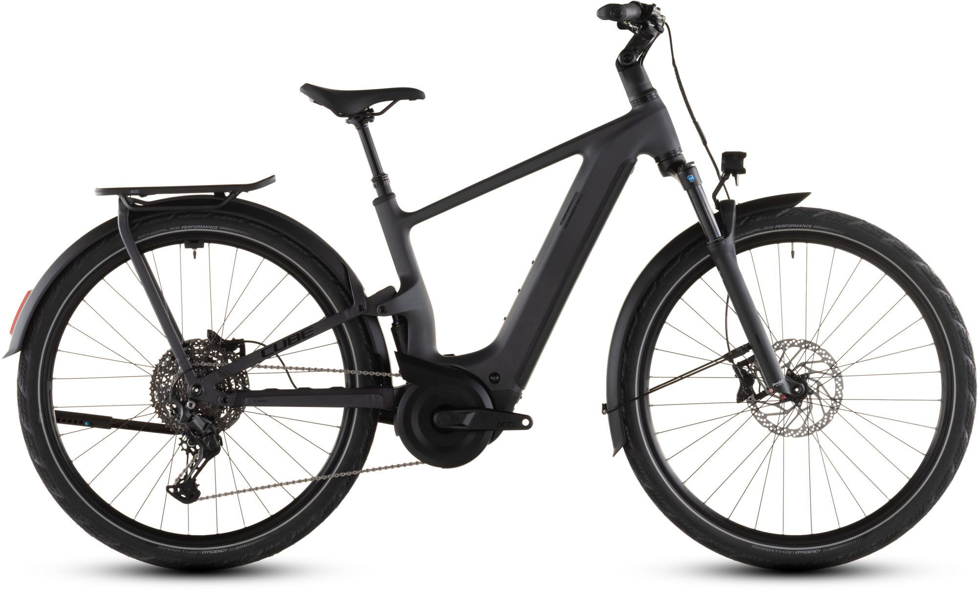 | Features | Combining everything we know about full suspension and rugged touring bikes in a single frame, the Kathmandu Hybrid ONE11 HPC from CUBE represents a new breed of Bosch-powered adventure bikes. There's 100mm of rear-wheel travel from an incredibly neatly sited trunnion-mount shock, while the IC 3.0 rear carrier is incorporated into the aluminium rear triangle. Up front, the High Performance Carbon main frame houses a powerful Bosch CX drive and 800Wh PowerTube battery. Integrated Cable Routing complements the frame's clean looks, the derailleur hanger is UDH-compatible, and a chain guard is fitted as standard. It's all there so that you can ride further... in comfort. |