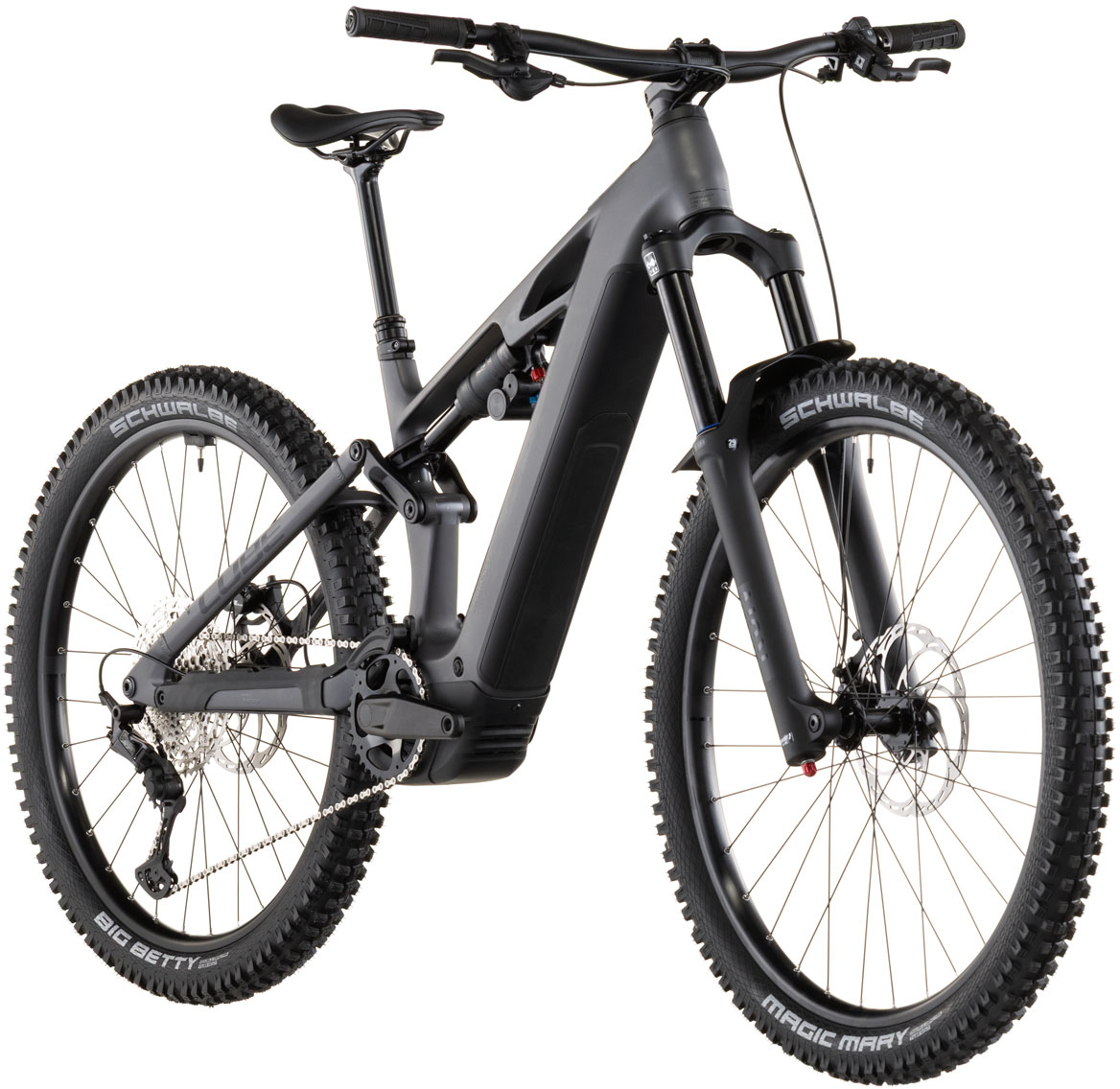 | Features | Frame descriptionThe Stereo Hybrid ONE77 HPC frame - with 170mm travel front and rear and a mullet wheel setup with 29in front and 27.5in rear - is all you need for big days out on big mountain trails. But as with all CUBE designs the devil is in the detail. So for example we added Integrated Cable Routing for super-clean looks and then threw in an angle-adjustable headset so that you can tweak the handling to your taste. The 800Wh PowerTube battery sits unobtrusively in the carbon down tube just above the Bosch CX drive. A UDH dropout on the aluminium rear triangle is tough and future-proof and we also added a Direct Mount chain guide to keep you driving forwards even when the going gets rough. The Stereo Hybrid ONE77 HPC frame - with 170mm travel front and rear and a mullet wheel setup with 29in front and 27.5in rear - is all you need for big days out on big mountain trails. But as with all CUBE designs the devil is in the detail. So for example we added Integrated Cable Routing for super-clean looks and then threw in an angle-adjustable headset so that you can tweak the handling to your taste. The 800Wh PowerTube battery sits unobtrusively in the carbon down tube just above the Bosch CX drive. A UDH dropout on the aluminium rear triangle is tough and future-proof and we also added a Direct Mount chain guide to keep you driving forwards even when the going gets rough. Frame: C:62® Monocoque Advanced Twin Mold Technology Aluminium 6061 T6 Rear Triangle Efficient Trail Control FSP 4-Link Agile Trail Geometry Boost 148 UDHTM Full Integrated Battery Advanced Internal Cable Routing Fork: SR Suntour Aion 38X 2CR Air Tapered 15x110mm Lockout 170mm Shock: SR Suntour TRIAir 2CR 230x65mm Shock hardware: Front: 30x8mm Rear: DU-Bushing 12.7mm Headset: ACROS AZF-675 ICR (Integrated Cable Routing) Top Zero-Stack 1 1/2" (ZS 56mm) Bottom Zero-Stack 1 1/2" (ZS 56mm) Fiber Inserts for Angle Adjustment X-Connect Interface Stem: CUBE Performance Stem E-MTB 35 FPI-Link Handlebar: CUBE Rise Trail Bar 35 Grips: ACID Disrupt Soft Compound Rear derailleur: Shimano XT RD-M8100-SGS ShadowPlus 12-Speed Chain guide: Reverse Flip-Guide E-Chain Guide Direct Mount I-Plate Shifters: Shimano Deore SL-M6100 Rapidfire-Plus Brake system: Magura Louise Front 4-Piston/Rear 4-Piston Hydr. Disc Brake (203/203) Crankset: ACID MTB Hybrid Pro 36T Crankset chainring sizes: 36T Cassette: Shimano Deore CS-M6100 10-51T Number of gears: 12 Chain: KMC e12 Wheelset (system wheels): ACID SLX 30 32/32 Spokes 15x110mm/12x148mm Tubeless Ready Front tire: Schwalbe Magic Mary Performance 2.4 Rear tire: Schwalbe Big Betty Performance 2.4 Pedals: ACID PP MTB Saddle: ACID Venec EMTB Trail 140 Seat post: CUBE Dropper Post Handlebar Lever Internal Cable Routing 31.6mm Seat post = dropper Yes/No: YES Seat post clamp: CUBE Semi-Integrated Engine: Bosch Drive Unit Performance Line CX max. 100Nm (BDU38) Battery: Bosch PowerTube 800 Charger: Bosch 2A Remote: Bosch System Control incl. Mini Remote |