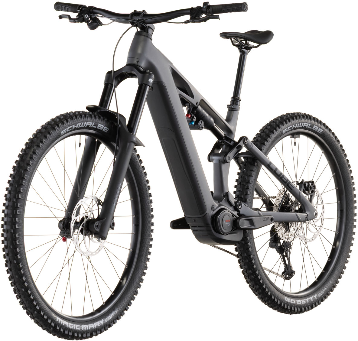 | Features | Frame descriptionThe Stereo Hybrid ONE77 HPC frame - with 170mm travel front and rear and a mullet wheel setup with 29in front and 27.5in rear - is all you need for big days out on big mountain trails. But as with all CUBE designs the devil is in the detail. So for example we added Integrated Cable Routing for super-clean looks and then threw in an angle-adjustable headset so that you can tweak the handling to your taste. The 800Wh PowerTube battery sits unobtrusively in the carbon down tube just above the Bosch CX drive. A UDH dropout on the aluminium rear triangle is tough and future-proof and we also added a Direct Mount chain guide to keep you driving forwards even when the going gets rough. The Stereo Hybrid ONE77 HPC frame - with 170mm travel front and rear and a mullet wheel setup with 29in front and 27.5in rear - is all you need for big days out on big mountain trails. But as with all CUBE designs the devil is in the detail. So for example we added Integrated Cable Routing for super-clean looks and then threw in an angle-adjustable headset so that you can tweak the handling to your taste. The 800Wh PowerTube battery sits unobtrusively in the carbon down tube just above the Bosch CX drive. A UDH dropout on the aluminium rear triangle is tough and future-proof and we also added a Direct Mount chain guide to keep you driving forwards even when the going gets rough. Frame: C:62® Monocoque Advanced Twin Mold Technology Aluminium 6061 T6 Rear Triangle Efficient Trail Control FSP 4-Link Agile Trail Geometry Boost 148 UDHTM Full Integrated Battery Advanced Internal Cable Routing Fork: SR Suntour Aion 38X 2CR Air Tapered 15x110mm Lockout 170mm Shock: SR Suntour TRIAir 2CR 230x65mm Shock hardware: Front: 30x8mm Rear: DU-Bushing 12.7mm Headset: ACROS AZF-675 ICR (Integrated Cable Routing) Top Zero-Stack 1 1/2" (ZS 56mm) Bottom Zero-Stack 1 1/2" (ZS 56mm) Fiber Inserts for Angle Adjustment X-Connect Interface Stem: CUBE Performance Stem E-MTB 35 FPI-Link Handlebar: CUBE Rise Trail Bar 35 Grips: ACID Disrupt Soft Compound Rear derailleur: Shimano XT RD-M8100-SGS ShadowPlus 12-Speed Chain guide: Reverse Flip-Guide E-Chain Guide Direct Mount I-Plate Shifters: Shimano Deore SL-M6100 Rapidfire-Plus Brake system: Magura Louise Front 4-Piston/Rear 4-Piston Hydr. Disc Brake (203/203) Crankset: ACID MTB Hybrid Pro 36T Crankset chainring sizes: 36T Cassette: Shimano Deore CS-M6100 10-51T Number of gears: 12 Chain: KMC e12 Wheelset (system wheels): ACID SLX 30 32/32 Spokes 15x110mm/12x148mm Tubeless Ready Front tire: Schwalbe Magic Mary Performance 2.4 Rear tire: Schwalbe Big Betty Performance 2.4 Pedals: ACID PP MTB Saddle: ACID Venec EMTB Trail 140 Seat post: CUBE Dropper Post Handlebar Lever Internal Cable Routing 31.6mm Seat post = dropper Yes/No: YES Seat post clamp: CUBE Semi-Integrated Engine: Bosch Drive Unit Performance Line CX max. 100Nm (BDU38) Battery: Bosch PowerTube 800 Charger: Bosch 2A Remote: Bosch System Control incl. Mini Remote |