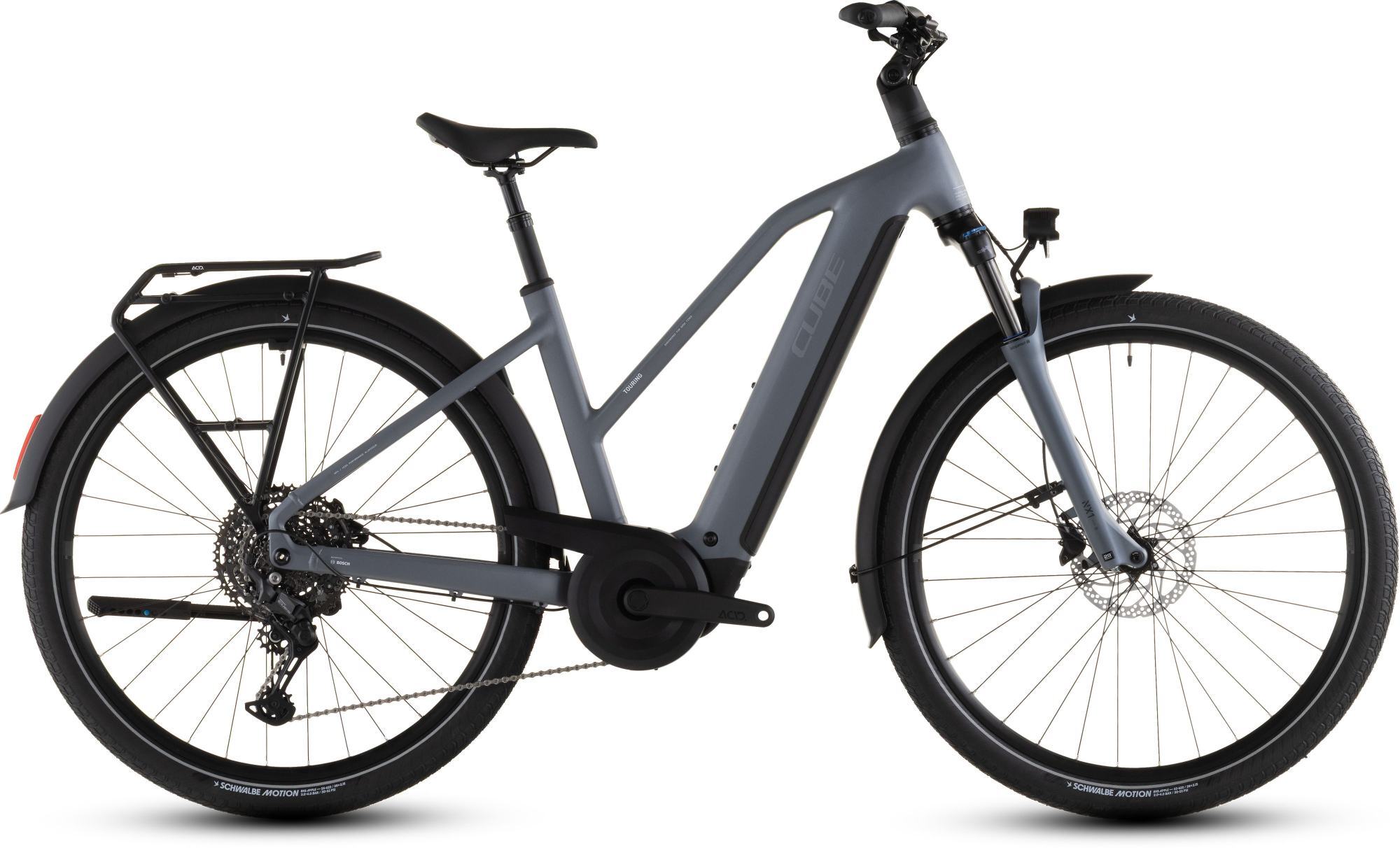 Features | There's a set of smooth strong Shimano hydraulic disc brakes to ensure you can stop safely in any weather. Practical accessories like the sturdy Semi Integrated Carrier 2.0 mudguards lights and kickstand mean you've everything you need for work or play. Efficient Comfort Geometry and an air-sprung suspension fork help make every journey a pleasure. And because we designed a wide range of sizes and a choice of frame styles there's bound to be one that'll suit you perfectly. It looks familiar but the Touring Hybrid is full of neat design touches to make your life easier. For starters there's our neat sturdy Semi Integrated Carrier 2.0 - because it makes it simple to carry what you need with you. There's an ACID chain guard kickstand full-length mudguards and lighting set too. The powerful Bosch Performance PX motor and 800Wh PowerTube battery are so neatly integrated into the design you'll barely notice they're there - apart from the extra help at the pedals of course. And Efficient Comfort Geometry is designed around a 100mm-travel suspension fork for smooth and confidence-inspiring steering even on rough roads. Frame: Aluminium Superlite Gravity Casting Technology Efficient Comfort Geometry Boost148 UDHTM Fully Integrated Battery SIC 2.0 Advanced Internal Cable Routing Integrated Seatclamp Fork: SR Suntour NX1-32 LO Air Tapered 15x110mm 100mm Headset: ACROS AZF-1035 ICR (Integrated Cable Routing) Top Zero-Stack 1 1/2" (ZS 56mm) Bottom Zero-Stack 1 1/2" (ZS 56mm) HIC Stem: CUBE Comfort Stem Pro 31.8mm Adjustable Handlebar: CUBE Comfort Trail Bar 700mm Grips: ACID Travel Comfort Rear derailleur: Shimano Cues RD-U6000-GS 11-Speed Shifters: Shimano Cues SL-U6000 Rapidfire-Plus Brake system: Shimano BR-MT200 Hydr. Disc Brake (180) Crankset: ACID Trekking Hybrid 40T Crankset chainring sizes: 40T Cassette: Shimano Cues CS-LG400 11-50T Number of gears: 11 Chain: KMC eGlide Wheelset (system wheels): ACID Pro 25 32/32 Spokes 15x110mm/12x148mm Tubeless Ready Tires: Schwalbe Motion Big Apple PerfL 55-622 Pedals: ACID PP Trekking Saddle: ACID Sequence 180 Seat post: CUBE Suspension Seatpost HD 31.6mm Front light: ACID Front Light PRO-E 60 X-Connect 12V DC Rear light: ACID Mudguard Rear Light PRO-E 12V DC Kickstand: ACID FM Pure Kickstand Mudguard: ACID 57 SIC 2.0 Bell: Reich Cycle Bells Ringsound Carrier: ACID SIC 2.0 RILink Engine: Bosch Drive Unit Performance Line PX max. 90Nm (BDU34) Battery: Bosch PowerTube 800 Charger: Bosch 2A Remote: Bosch Purion 200 with Integrated Display |
